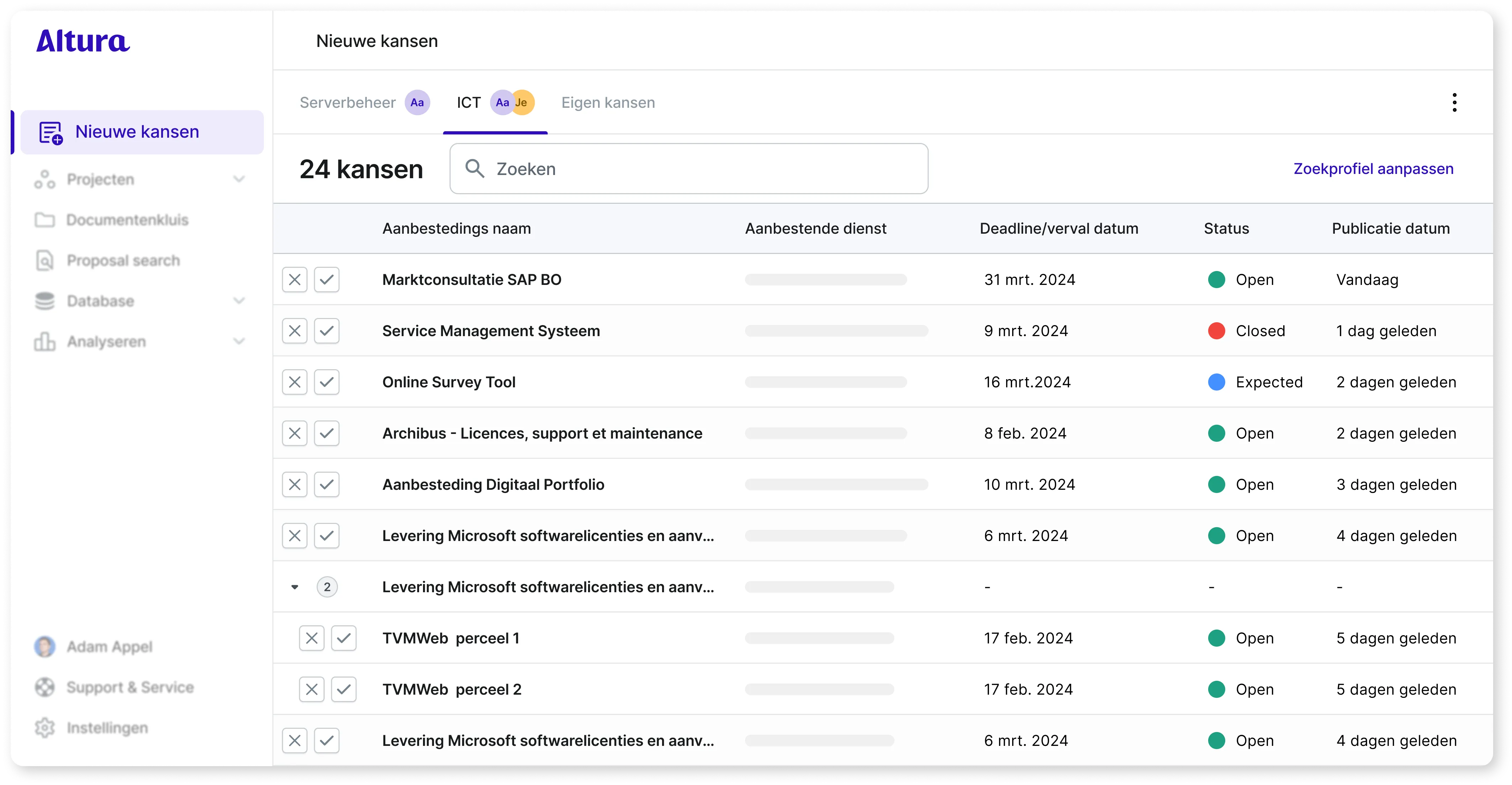 Één ding is zeker, er ligt nu te veel afhankelijkheid om nieuwe aanbestedingen te vinden door middel van de dagelijkse mail. Deze wordt vervangen door een dashboard in Altura. Hierdoor zijn gebruikers niet afhankelijk van een dagelijkse email, maar kunnen ze altijd de nieuwe aanbestedingen terug vinden in een handig overzicht. Natuurlijk krijg je nog wel een dagelijks seintje dat er nieuwe relevante aanbestedingen voor je zijn gevonden. Maar dit kan je direct openen in Nieuwe Kansen.