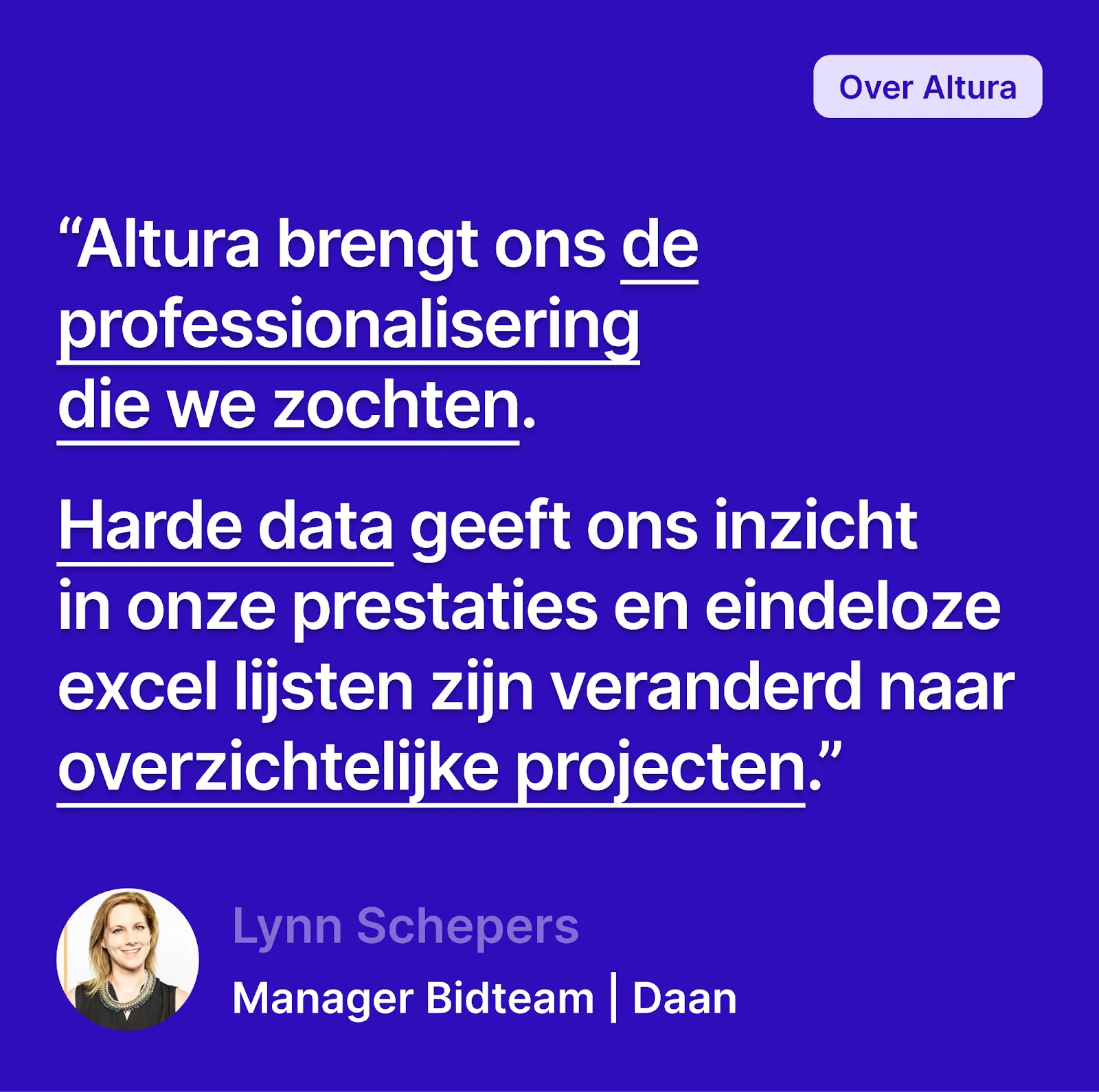 “Op gevoel weten we alles, maar als bid management leider wil ik een onderbouwd rapport uit het systeem halen dat harde data laat zien. Daarom hebben we Altura aangeschaft.” Lynn Schepers, Manager Bidteam.