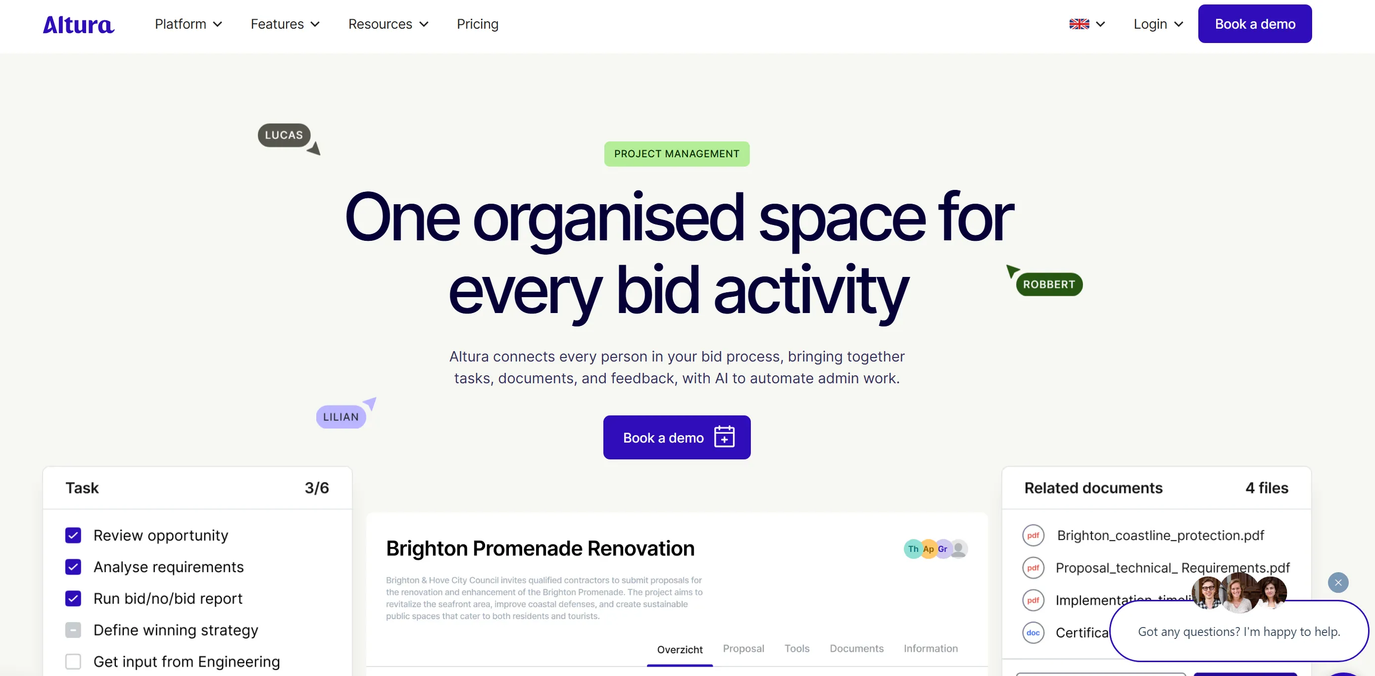 The features of Altura are the most advanced in its class. AI automatically generates summaries of tenders, searches underlying documents for your search terms, and assesses risks based on your inputs.