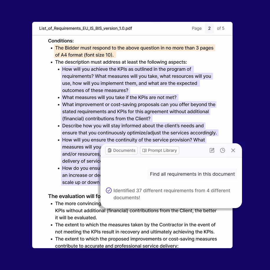 Engineers besteden uren aan het handmatig doorzoeken van omvangrijke, zeer technische aanbestedingsdocumentenvan op zoek naar eisen, referenties en risico's.