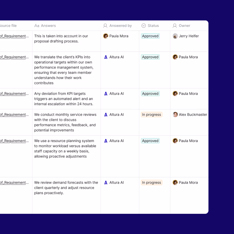 Altura centraliseert alle bid kennis, zodat teams gevalideerde content eenvoudig kunnen hergebruiken met een directe koppeling naar de actuele tender eisen.