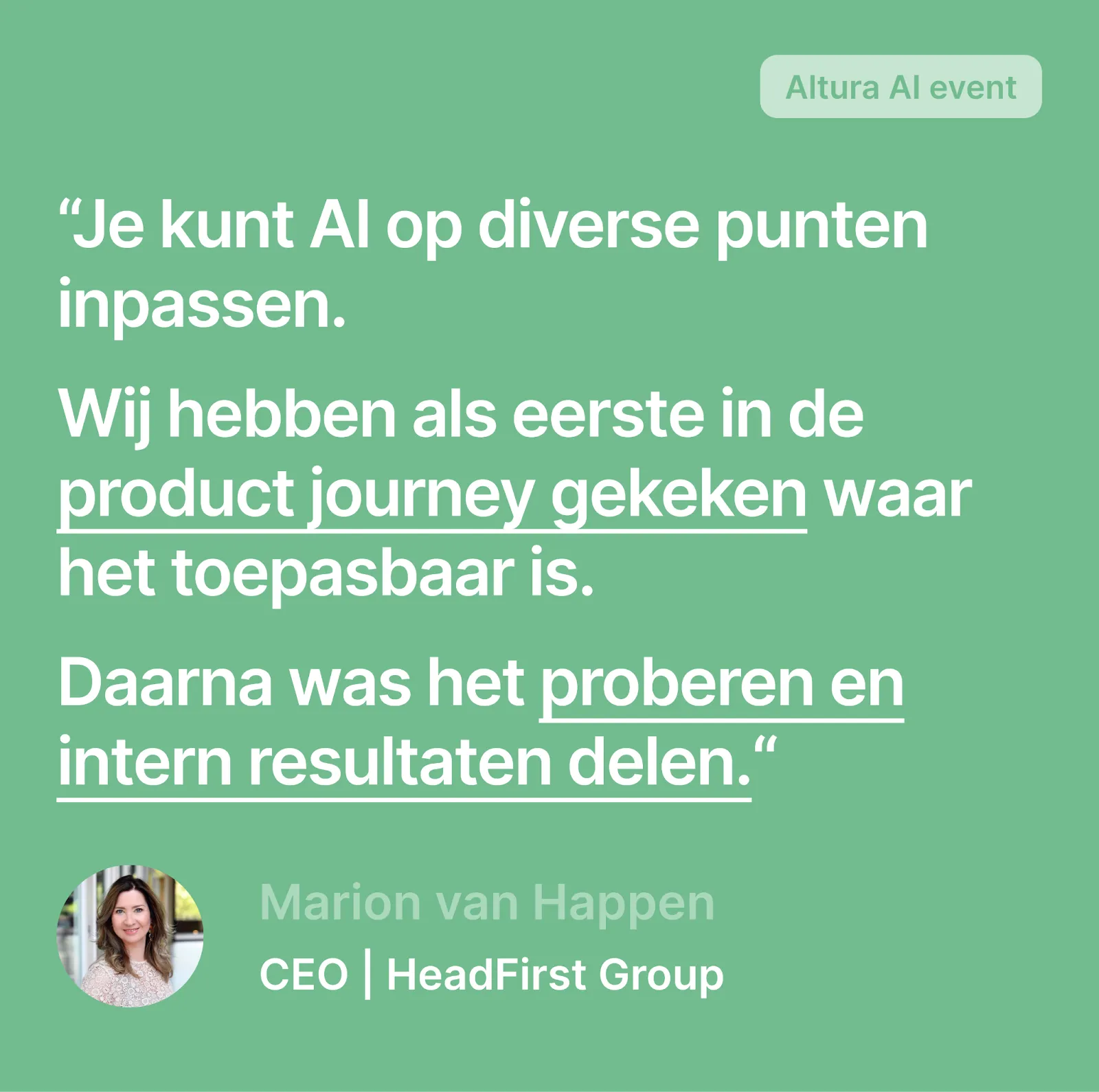 Je begint tegenwoordig erg makkelijk met AI. Marion van Happen, CEO van HeadFirst Group, implementeert AI organisatiebreed en doet dat vooral door onderling usecases te delen.